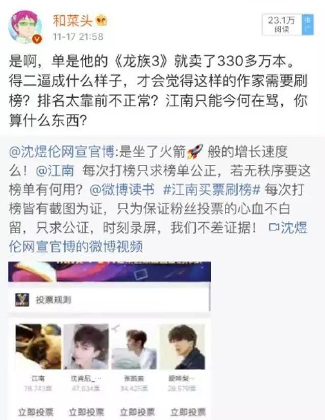 沈煜伦的粉丝指责江南刷榜 | 新浪微博:@和菜头