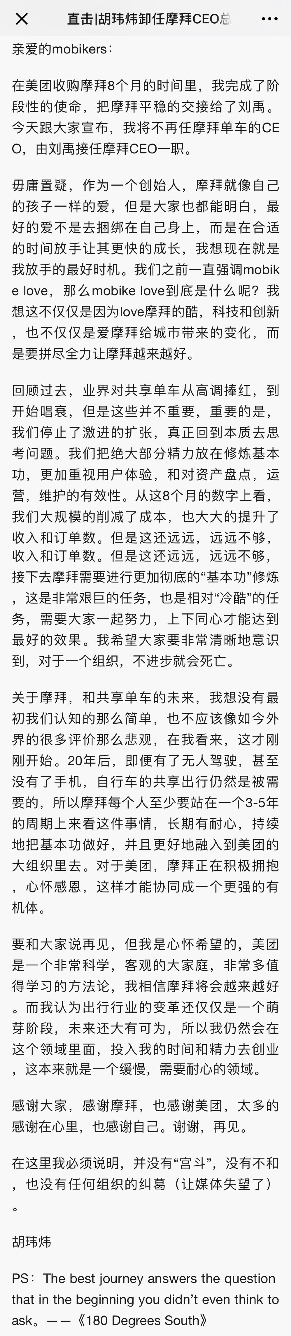 胡玮炜在离职的内部信中提到:“在这里我必须说明,并没有‘宫斗’,没有不和,也没有任何组织的纠葛(让媒体失望了)。”也许被收购那天,胡玮炜们也知道,离开是必然的,这半年多时间,也是给摩拜融入美团一个过渡期。#媒体没有失望