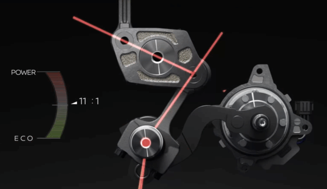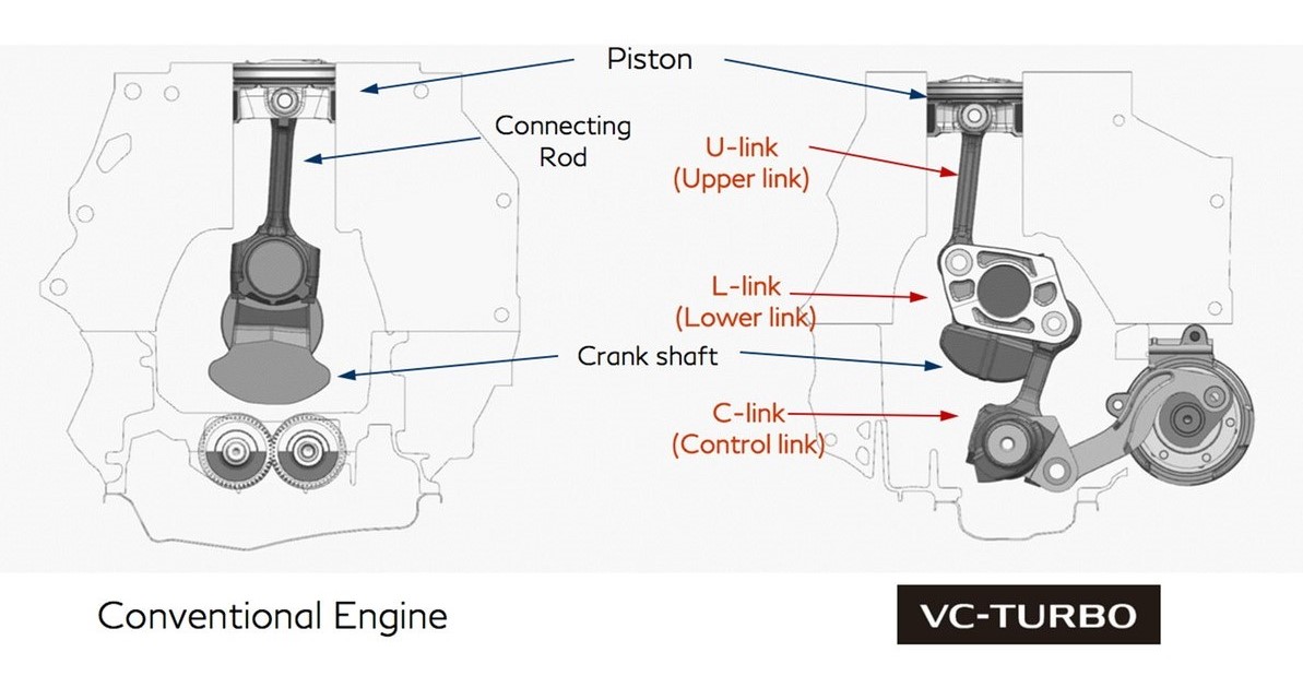 说回日产这台 VC-TURBO,它可以实现压缩比在 8:1 到 14:1 之间无级调整,实现可变压缩比的结构也十分巧妙。日产对普通发动机的连杆和曲轴部分大作改动,变为三个部分组成的多连杆结构;发动机底部外侧加入一台专用电机,电机连接着底部连杆。