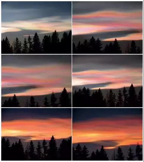一组珠母云随时间变化的照片,在挪威南部Leirsund拍摄。拍摄时间:2008年1月20日日落后的傍晚,拍摄者:F. Prata