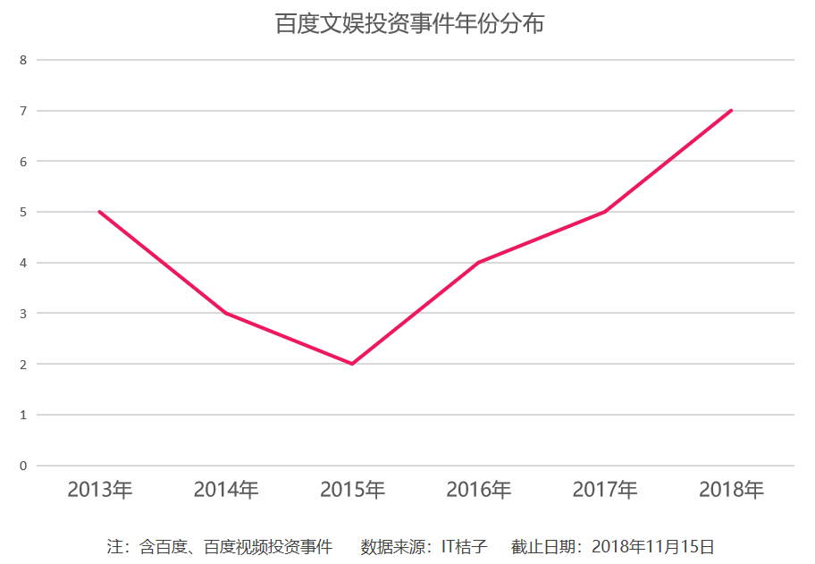 IT 桔子统计数字显示,截止 2018 年 11 月 25 日,百度在文娱领域共计参与投资 24 起,并购 6 起。