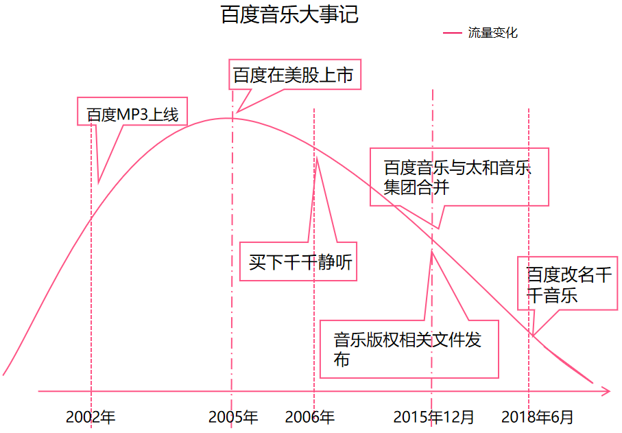 2002 年,百度上线 MP3 搜索服务,使百度搜索流量剧增,一度占据百度整体流量的三分之一。这种情况持续至 2015 年,国家版权局和广电总局分别发布:《关于责令网络音乐服务商停止未经授权传播音乐的通知》《关于大力推进我国音乐产业发展的若干意见》两部指导意见。版权概念兴起直接影响到百度音乐搜索业务,流量骤减。2015 年 12 月,百度借“航母计划”将音乐业务拆分出去,与太合音乐集团合并。2018 年 6 月,百度音乐改名千千音乐。