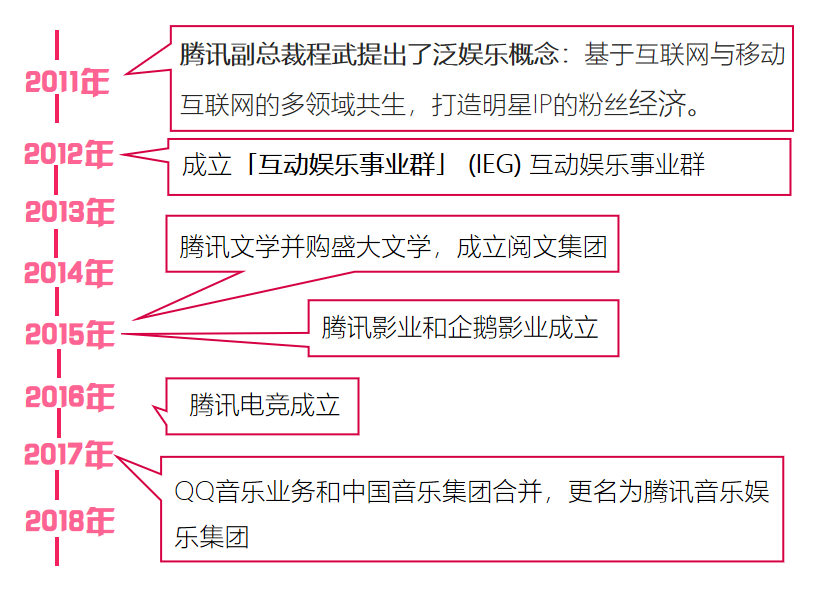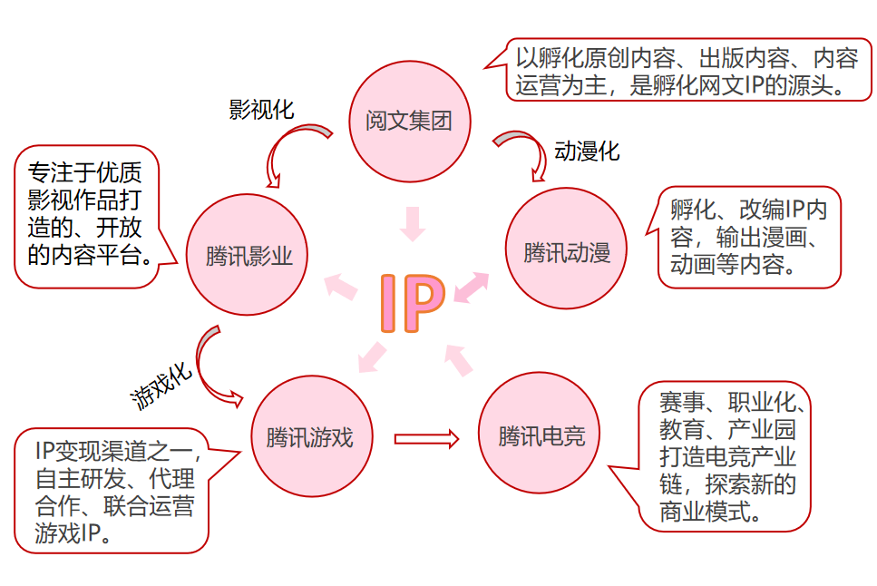 至 2018 年,腾讯已经构建起阅文集团、腾讯影业、腾讯游戏、腾讯电竞、腾讯动漫五大业务。