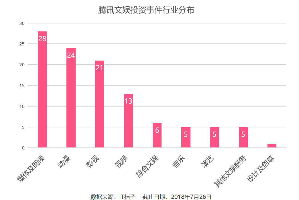 从子行业分布来看,腾讯在在文娱领域,更加注重在媒体及阅读领域的布局,共计参与投资 28 起;动漫领域腾讯参投 24 起,其次是影视领域,腾讯参投 21 起。其余领域中,腾讯参与投资数量均较少。