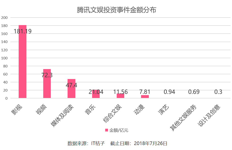 金额方面,腾讯在影视领域,共计投资约合 181.19 亿元;其次是视频领域,共计投入 72.3 亿元;媒体及阅读领域,腾讯投入 47.4 亿元;音乐领域腾讯投入 21.04 亿元;综合文娱领域投入 11.56 亿元。