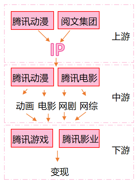 腾讯动漫和腾讯文学生产和孵化 IP,腾讯电影和腾讯动漫输出动画、电影、网剧网综内容,同时借助分发平台腾讯影业将 IP 进一步孵化扩大,腾讯游戏和腾讯影业则负责 IP 变现。围绕腾讯产业链本身,腾讯在上中下游也做了相关布局,与腾讯动漫、阅文集团、腾讯电影、腾讯游戏共同形成完整的产业链。