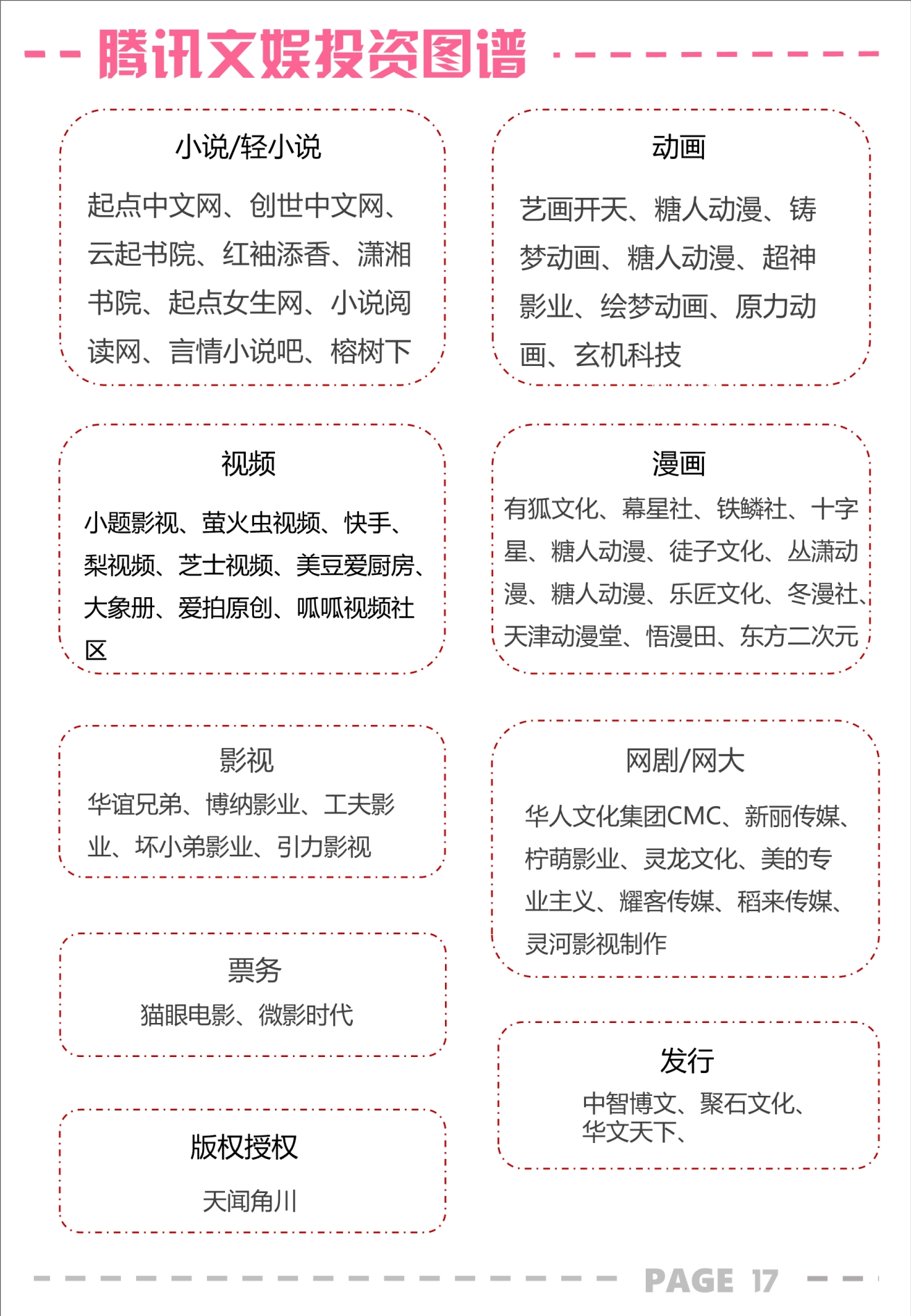 腾讯在文娱领域的投资策略最清晰,围绕 IP 布局全产业链,打通产业链上下游,形成自身孵化 IP 的能力。