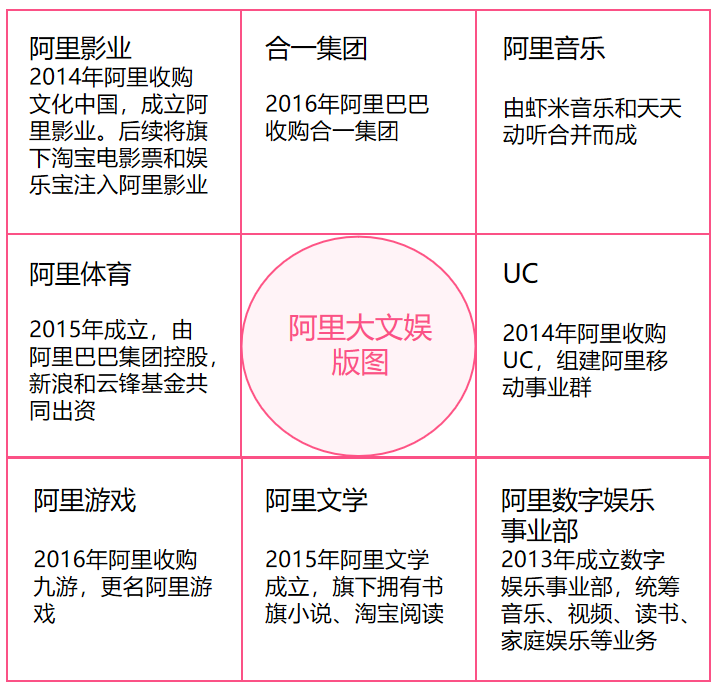 2014 年世界互联网大会上,马云表示:“十年以后最大的麻烦是健康和快乐问题……假设我们今天开始准备,十年以后既解决社会问题,同时也是我们的机会。我觉得今后阿里要做健康和快乐两个产业。”围绕这种理念,阿里在文娱领域积极扩展自身业务。