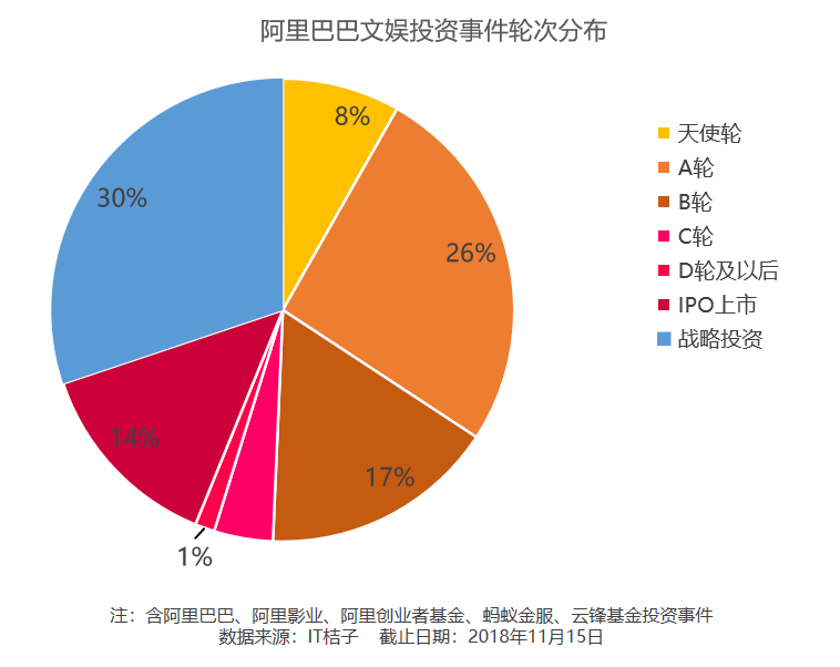 从轮次方面可以看到阿里坚持了其“购买行业头部公司”的投资理念,主要以战略投资和上市投资为主,买下优酷、博纳影业,投资华谊兄弟、光线传媒、万达电影。