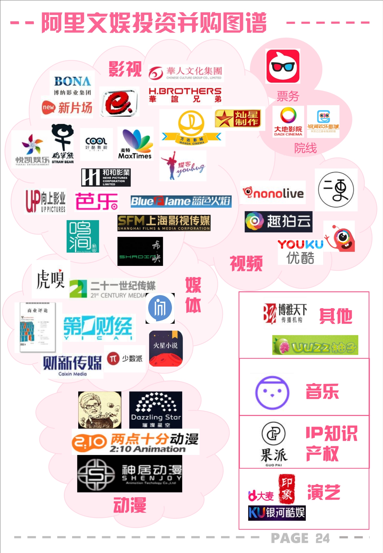 可以看到阿里正在积极探索以现有的资源串联起自身文娱产业,整合买来的各个板块。同时,阿里也没有停下“买买买”的步伐,在文娱领域投资了众多企业。