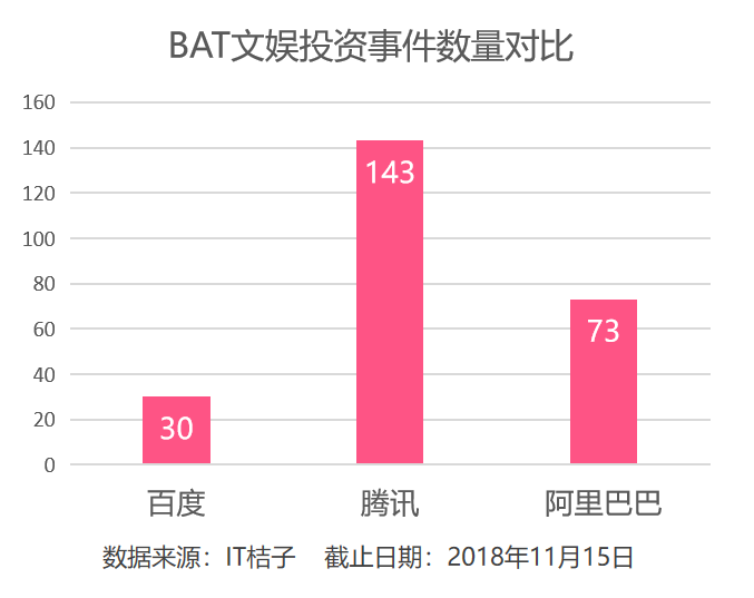 综合 BAT 三家在文娱领域的投资布局来看,至今,百度在文娱领域共计参与投资事件 24 起,并购事件 6 起;腾讯共计参与文娱领域投资 143 起;阿里巴巴参与投资 73 起。