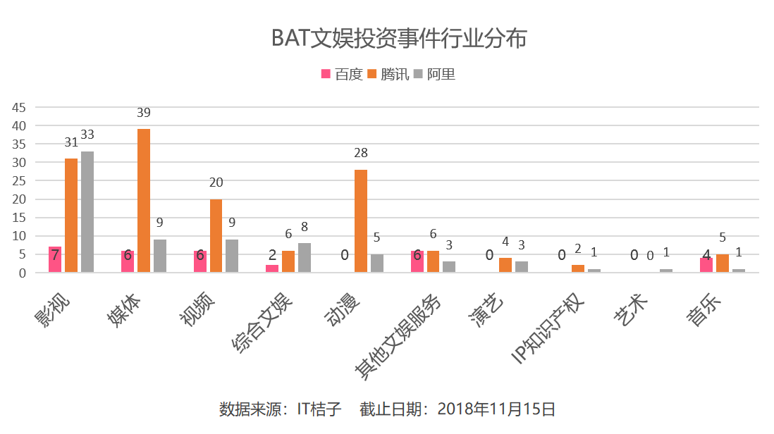 近期,IT 桔子整理了 BAT 三家在文娱领域的投资布局,通过分析它们的动作,了解它们投资的真实意图。