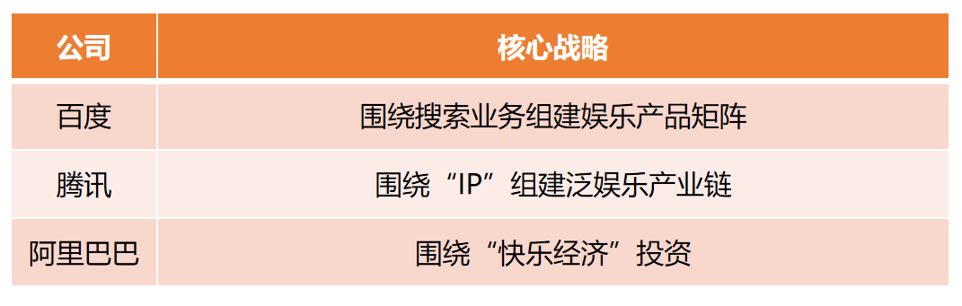 阿里方面,重点放在未来对“快乐经济”的投入上,通过大量的投资并购组建了自身“大文娱”板块。但板块之间相对独立,融合效果欠佳。