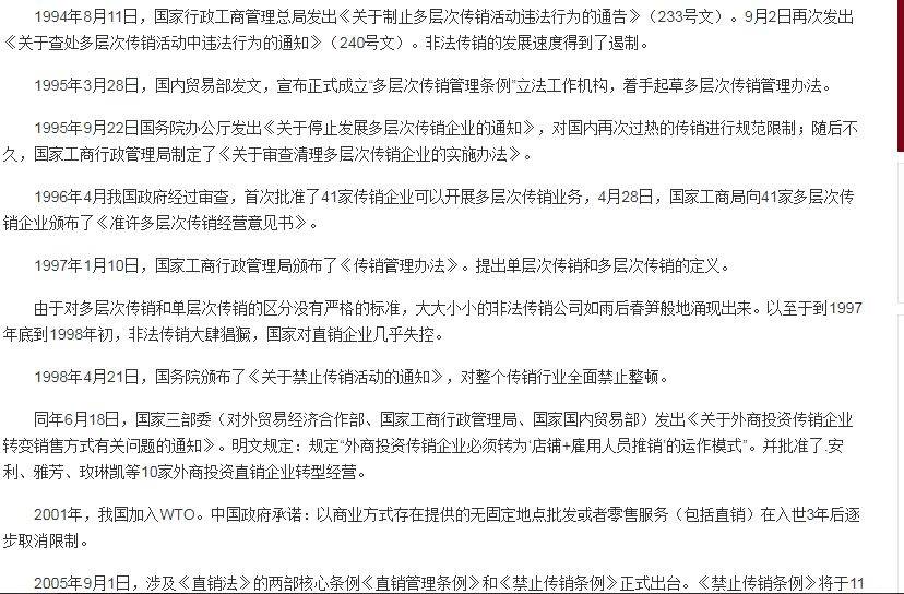 简单说,在1989年传入中国之后,不管是直销还是传销,一哄而上,“几乎失控”。到1998年,不耐烦了,干脆“一刀切”,传销近乎被取缔,安利等外资直销企业也都要求转为“店铺+雇员”运营。如果这样继续下去,大概也就不会有什么保健食品帝国了。