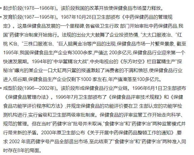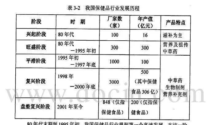 在这篇论文里,有一个保健(食)品行业发展的时间表,在这个表里,“第一个旺盛(发展)阶段是20世纪80年代末到1995年初。1995年到1997年经历了一个停滞期。1996年后相继出台了一些列保健品行业的制度规定。1998年底到2000年开始,进入了一个飞速发展的阶段。”