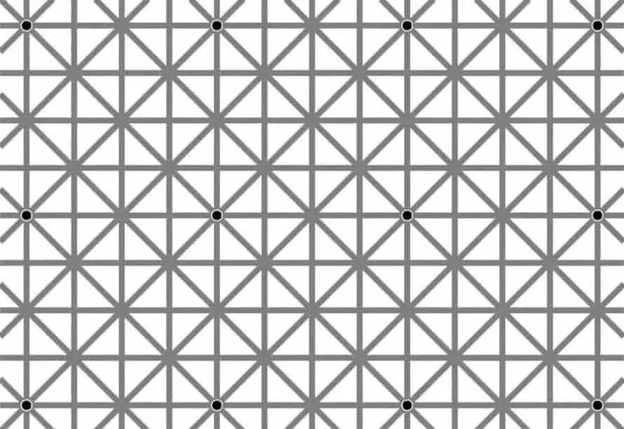 感知会经常蒙蔽我们。比方说,由Jacques Ninio设计的“12点错觉”作品。图里有十二个黑点,每行四个,一共三行。在纯白背景下,人可以同时看到这些黑点。但一旦黑点嵌在网格里之后,就只有你盯着看的时候才会出现。那些注意力范围外的黑点就神奇地消失了,仿佛被灰色对角线“吞噬”了一样。有趣的是,当我们盯着看的黑点的时候,都能看到周围那些相邻的一对点,或点线,或三角形、甚至正方形。虽然这些相邻的黑点能被看到,但也因为注意力没法永远集中的原因,就会常常消失不见。