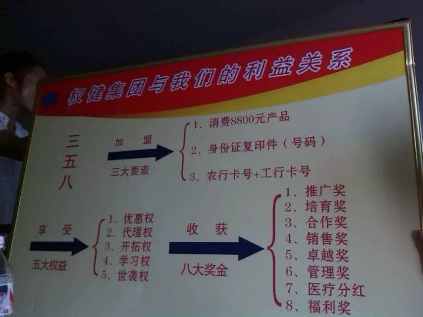 多位权健经销商的家属提供的资料显示,工资来源第一来自于月结月发的零售奖金,不同的星级代表,享受有不同的回馈额,一星级别是有9%,而五星则高达21%。由于会员是五折拿货,所以利润最高可达71%。除此之外,还有卓越奖、推广奖、培育奖、合作奖、管理奖和福利奖等。以推广奖为例,一个人只要建立A、B两个消费区,并各自拉55个人入伙后,推广奖即可封顶,周薪为5万元。