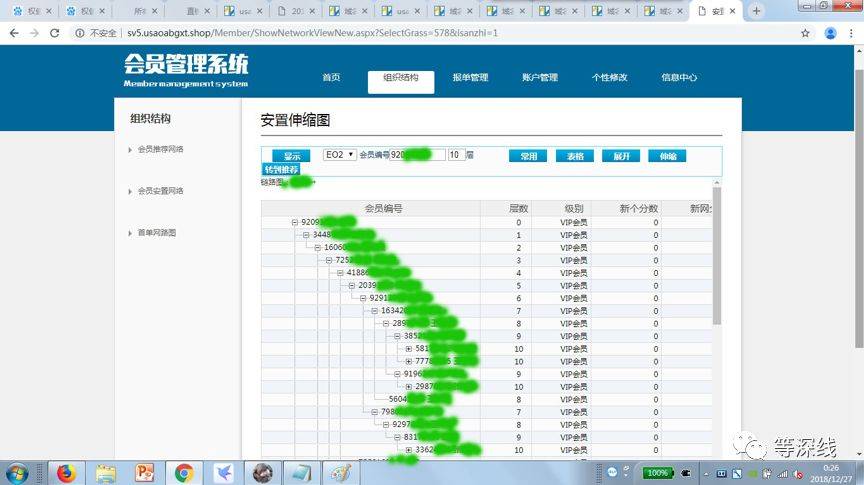 2018年12月26日,记者再次登录权健会员管理系统的新网址www.usaoabgxt.shop,发现该网址首页界面有所变化,但内页内容基本与此前一致。记者所登录账号显示,该会员账号下的人员层级至少达10层。