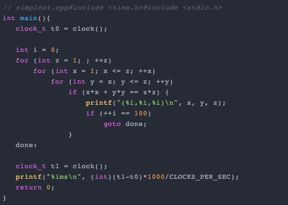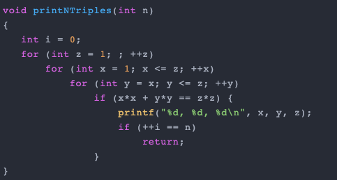 以下代码为简单的 C 函数打印第一个 N Pythagorean Triples: