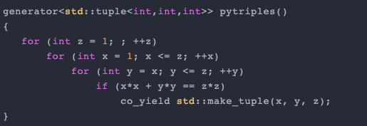 虽然实现的功能等同于三重嵌套 for 循环,但 C++ 20 标准下的代码让人感觉不是很清楚,无法立即读懂程序逻辑。如果 C ++ 有类似 coroutine 的概念,就可能实现三元组生成器,并且和原始的 for 循环嵌套一样清晰: