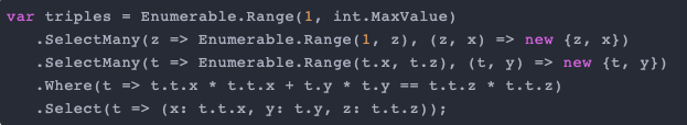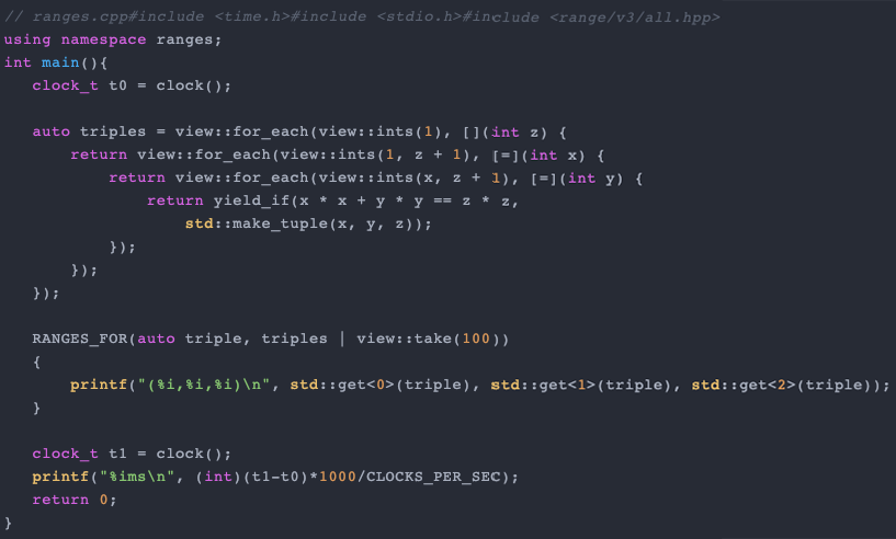 虽然 C++ 20 Ranges 还未正式发布,但本文使用了它的近似版,即 isrange-v3(由 Eric Niebler 编写),并编译了规范的“Pythagorean Triples with C ++ Ranges”示例: