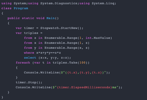 在 Mac 上编译这段代码,需要使用 Mono 编译器(本身是用 C#编写的),版本 5.16。mcs Linq.cs 需要 0.20 秒。相比之下,编译等效的简单 C#版本需要 0.17 秒。LINQ 样式为编译器创建了额外的 0.03 秒。但是,C ++ 却创造了额外的 3 秒。
