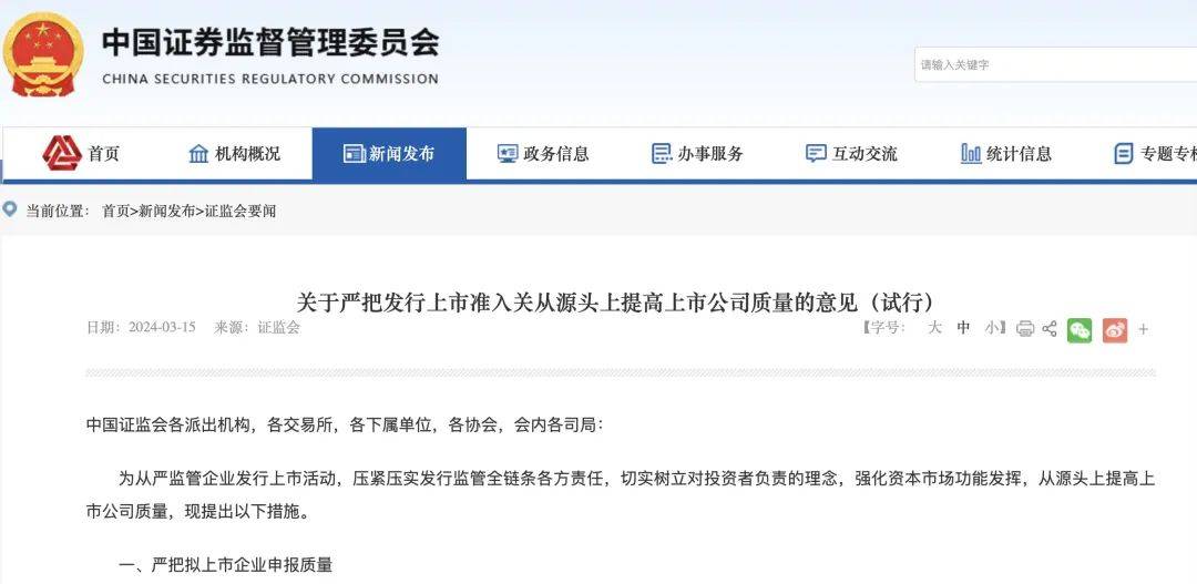 证监会表示,《关于严把发行上市准入关从源头上提高上市公司质量的意见(试行)》。提出了8项政策措施,对上市企业申报质量、压实中介机构看门人责任、优化多层次资本市场功能衔接等方面提出严格要求: