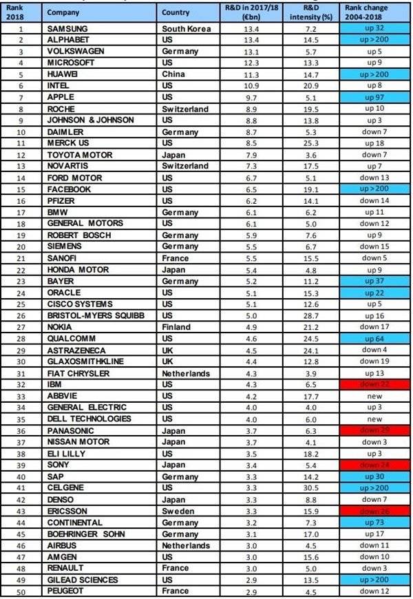 《2018年欧盟工业研发投资排名》中有日本公司339家、美国公司778家、欧盟国家公司577家、中国则有438家公司上榜,其中华为以113亿欧元的研发投入排名中国第一,世界第五。
