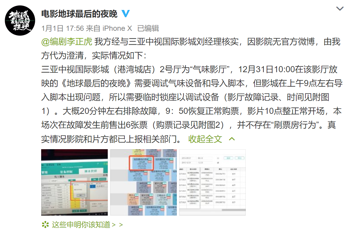@虎嗅【票房造假?《地球最后的夜晚》官博回应】署名为编剧李正虎的微博网友,在微博上实名举报《地球最后的夜晚》恶意刷票房的行为。随后《地球最后的夜晚》官方微博,就李正虎的举报做出了回应。