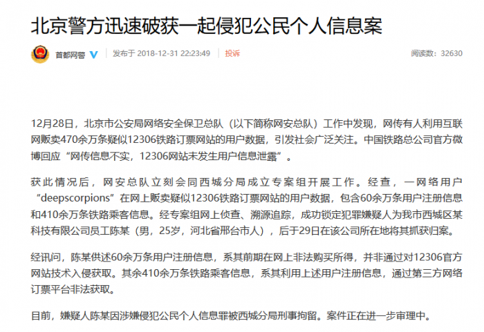 @中新网【470余万条疑似12306用户数据遭贩卖,嫌疑人被刑拘】据北京市公安局网络安全保卫总队微博消息,北京警方破获一起侵犯公民个人信息案,网上贩卖470余万条疑似12306铁路订票网站用户数据的犯罪嫌疑人陈某,已被刑拘。12月28日,北京市公安局网络安全保卫总队(以下简称网安总队)工作中发现,网传有人利用互联网贩卖470余万条疑似12306铁路订票网站的用户数据,引发社会广泛关注。中国铁路总公司官方微博回应“网传信息不实,12306网站未发生用户信息泄露”。