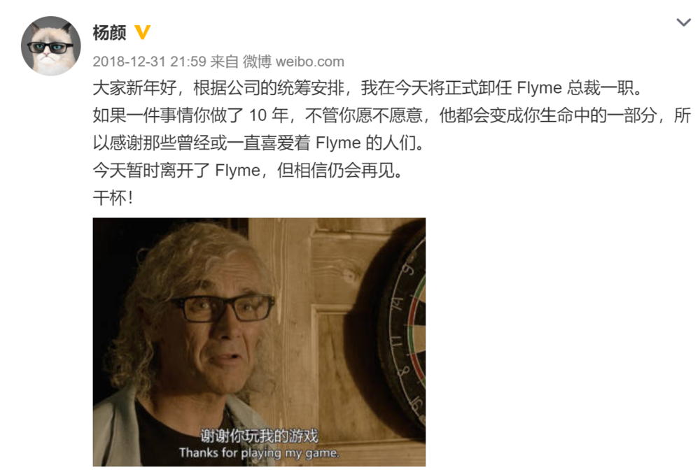 杨颜在微博中表示,根据公司的统筹安排,将在今天正式卸任Flyme总裁一职。如果一件事情你做了10年,不管你愿不愿意,他都会变成你生命中的一部分,所以感谢那些曾经或一直喜爱着Flyme的人们。另外杨颜还表示,今天暂时离开了Flyme,但相信仍会再见。