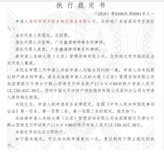 @虎嗅【顺丰起诉,ofo主体被法院裁定冻结1375万资金】依据中国裁判文书网信息显示,2018年10月,因运输合同纠纷,顺丰向广东省深圳市宝安区人民法院提出财产保全申请,请求冻结被东峡大通(北京)管理咨询有限公司(ofo的运营主体)在招商银行天津分行鞍山西道支行所设账户存款1375万元人民币。