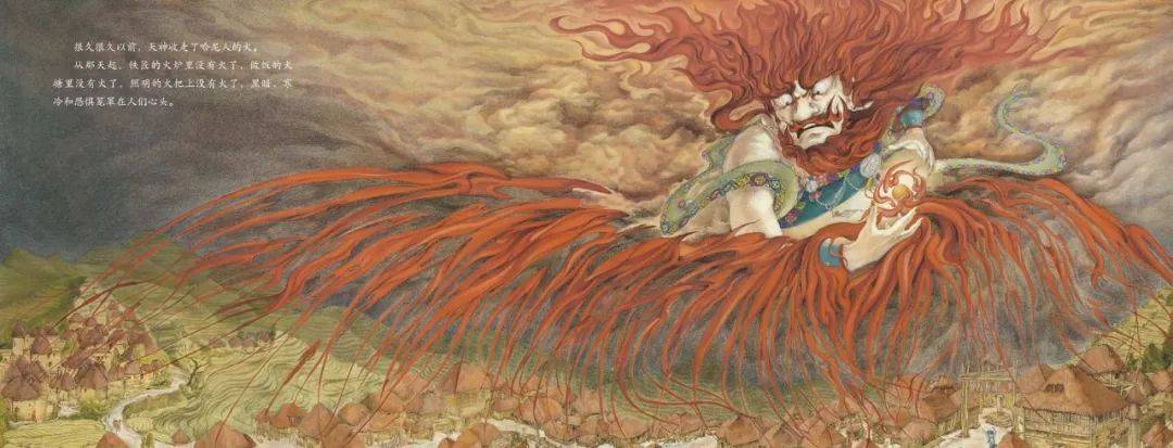 这是一个哈尼族的故事《火童》。原来的故事是魔王从地下跳出来抢走了哈尼人的火,所以少年明扎出发要杀死魔王,抢回我们的火种。魔王很强大,要杀死明扎——就是这样一个很典型的你死我活恨的故事。