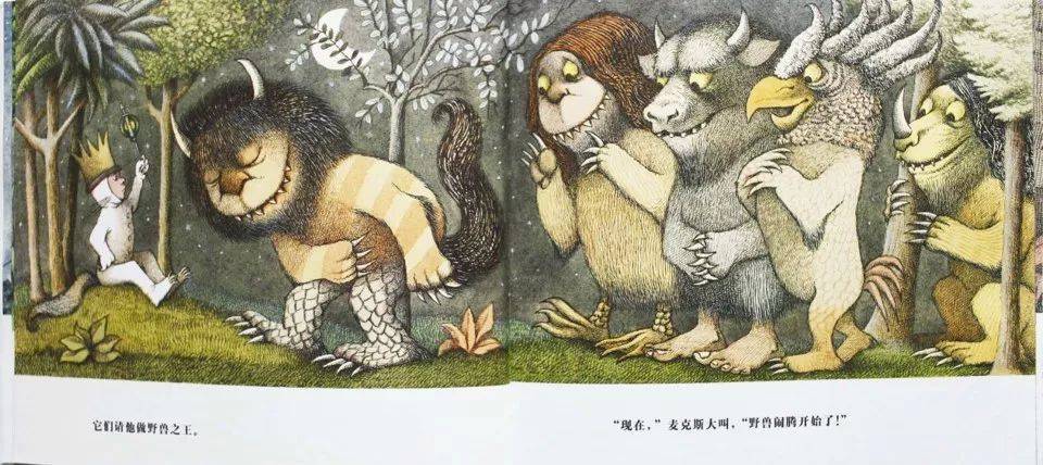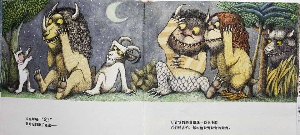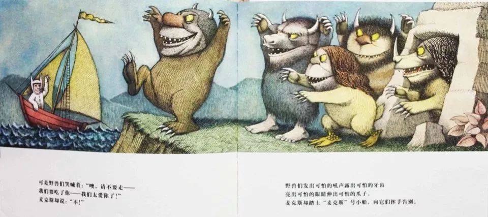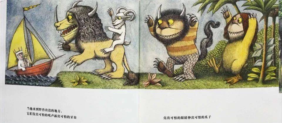 野兽很可怕,露着吓人的牙齿,发出可怕的吼声。但是麦克斯不怕它们,因为这是他自己的内心世界。