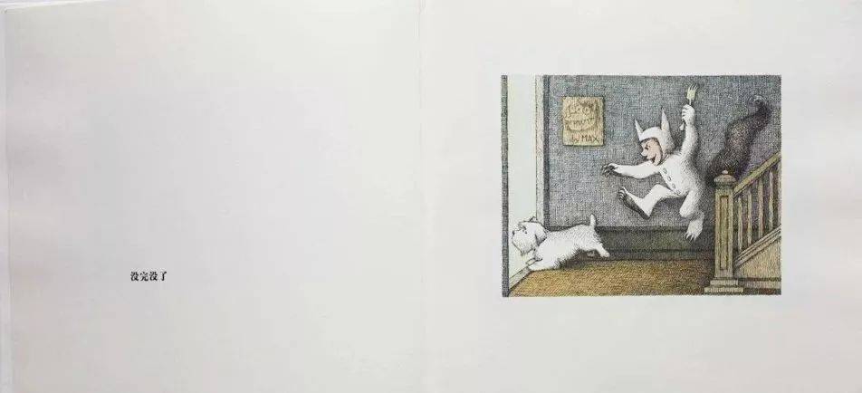 麦克斯回家去了。你看,绘本来是从右往左,回是从左往右,非常有法度的。