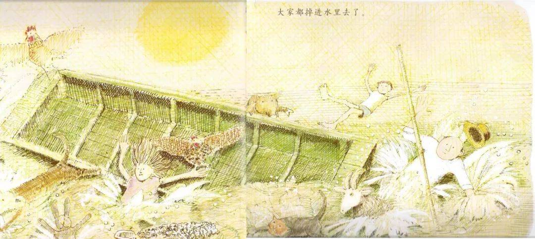 你看又是重复重复。后面还有,猪要来了,绵羊来了,鸡要来了,牛要来了,山羊要来了。甘伯伯的小船上就坐满了小动物和小朋友。