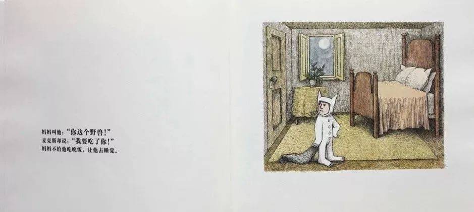男孩麦克斯穿上狼的外套在家里折腾,他折腾得没完没了。妈妈很生气,说,麦克斯,你这个野兽。麦克斯说:“我要吃了你。”于是妈妈生气了,不许他吃饭,让他回屋反省去。