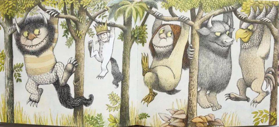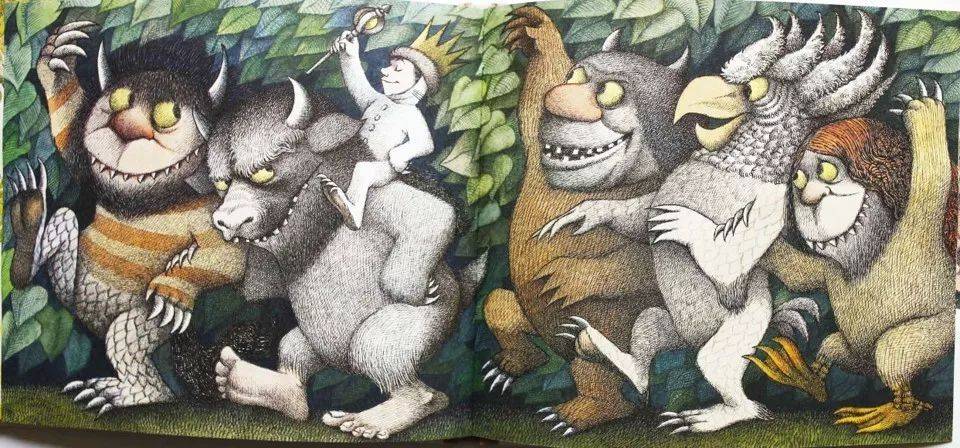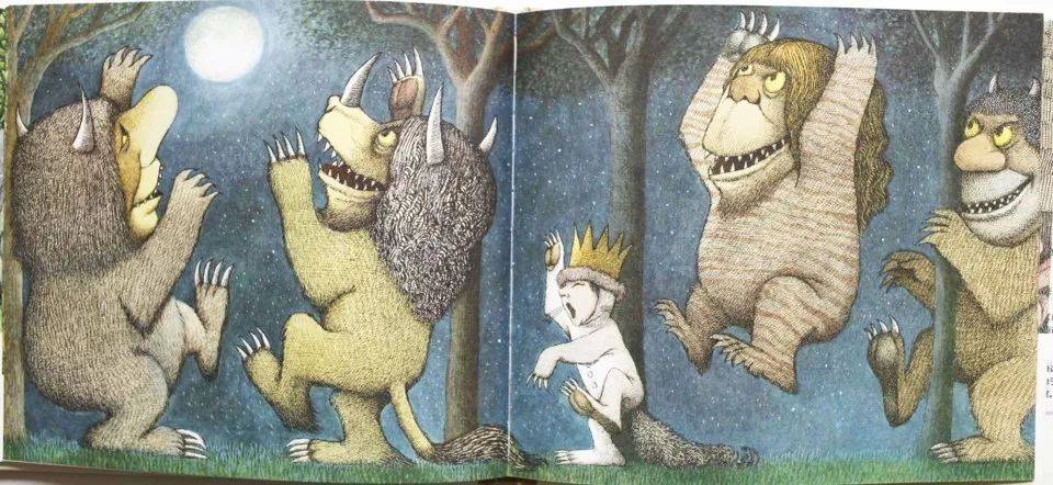 这是世界上第一本讲儿童负面情绪的绘本。我们现在看,这野兽好呆萌啊、好好玩啊。在当时是吓到大人的:天哪,我的孩子内心怎么是一堆野兽?孩子不是天使吗?孩子怎么会有负面情绪呢?