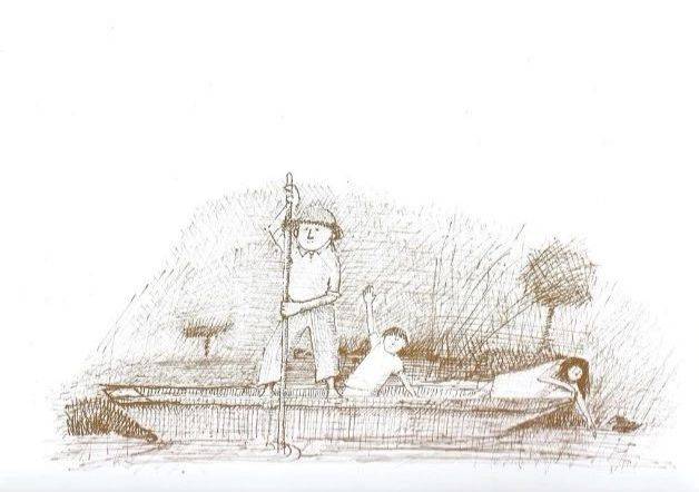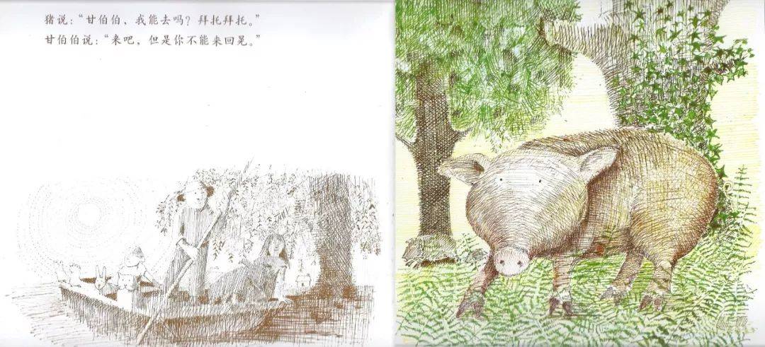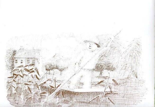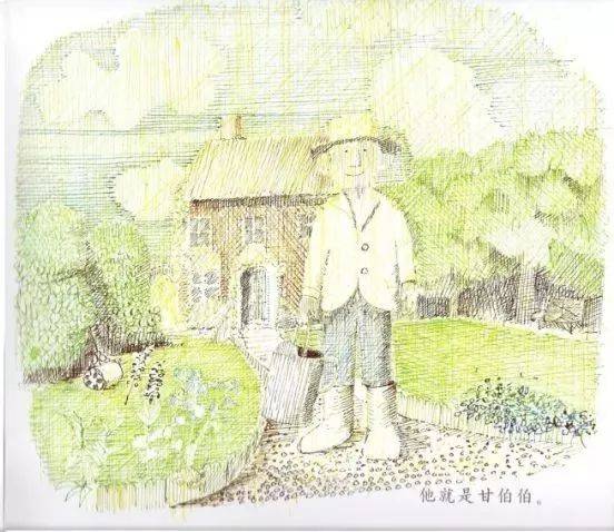 这是1970年英国的约翰·伯宁翰的作品,也是一位大师,我去小学课堂上就讲过这个故事。这是甘伯伯,他是一个住在英国乡间的绅士。他的门前有一条河,甘伯伯有一艘船,他就撑着船去游河。