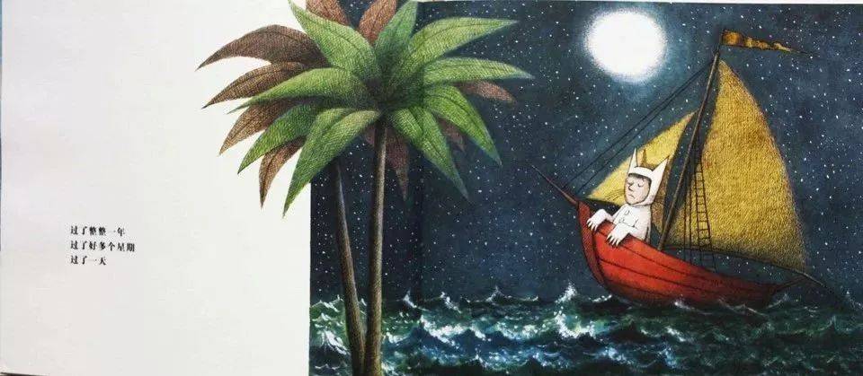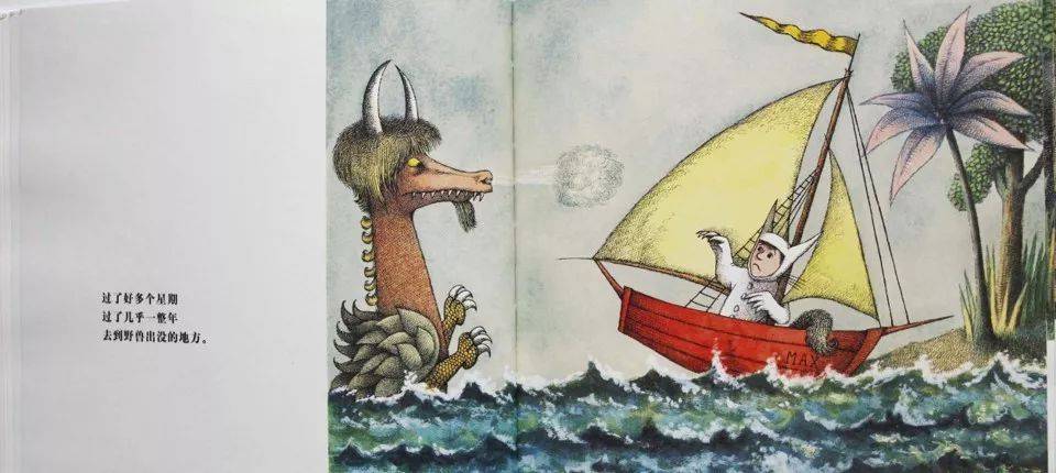 麦克斯在自己的世界里恣意地张扬,很开心。然后他在自己的世界里扬帆远行,走了很多的地方,到了一个野兽出没的地方。