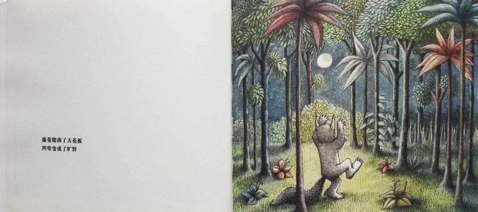往下走,你一页页地翻翻翻翻,你会发现麦克斯的世界在扩大。麦克斯的房间里森林长啊长,一直长满了天花板,长满了墙壁。