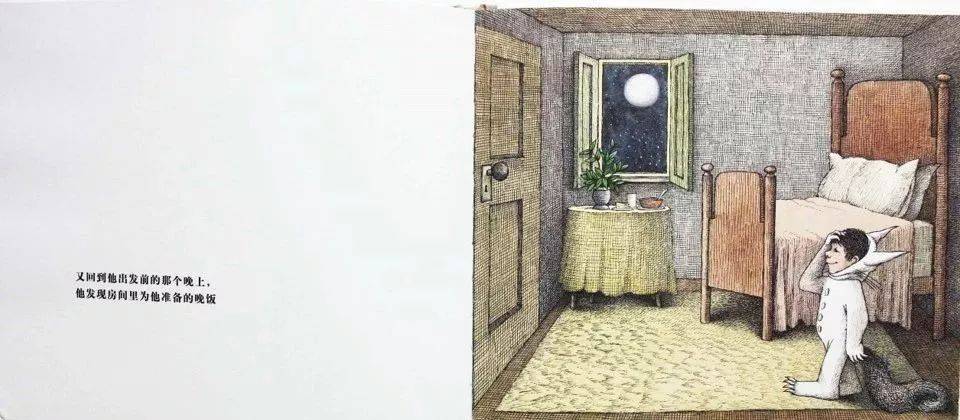 他一直回到了自己出发时那个夜晚,回到了他的房间。此时这个孩子的表情很惬意,很舒服,因为舒展了。而妈妈已经把饭菜放在桌上。