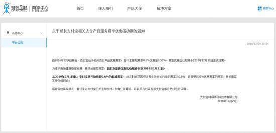 近日,支付宝发布《关于延长支付宝相关支付产品服务费率优惠活动期的通知》,通知要求从2019年2月1日起,支付宝将开始恢复0.6%的标准费率。此次影响范围仅涉及生效协议约定的费率为0.6%,且享受0.55%优惠费率的商家,其他商家不受任何影响。