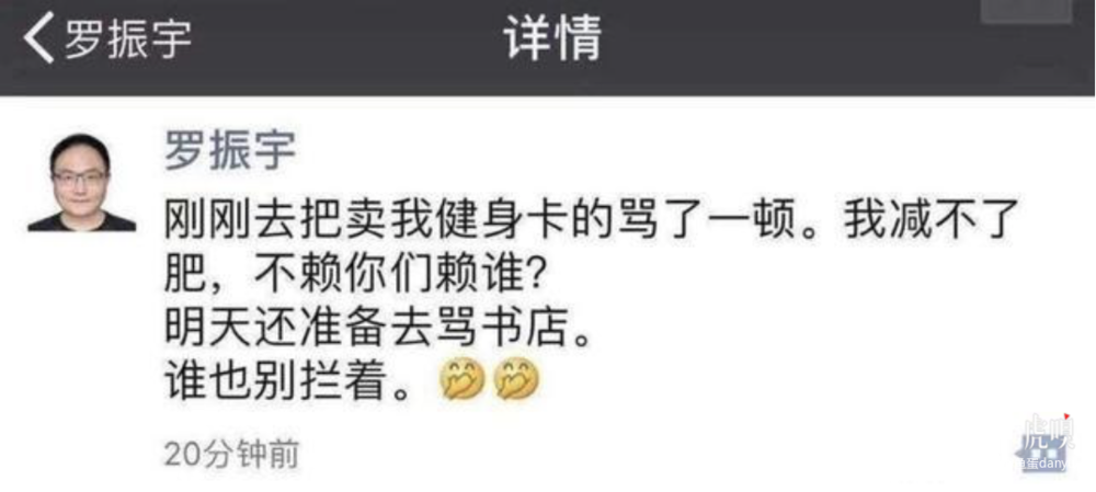 罗振宇近期发布一条朋友圈,疑似回应跨年演讲风波:刚刚去把卖我健身卡的骂了一顿。我减不了肥,不赖你们赖谁?明天还准备去骂书店,谁都别拦着。此前,罗振宇的跨年演讲《时间的朋友》被diss“中年人看罗振宇的演讲和老年人买权健的保健品没有任何区别”。