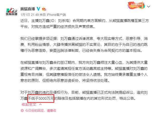 而就在新年第一天,熊猫直播也公开表示主播刘万鑫(ID:刘杀鸡)违约,要求3000万元赔偿。