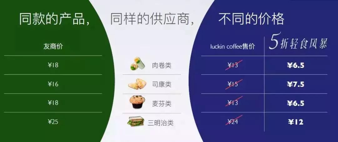 不仅是咖啡品类,这一年luckin在产品战术上的大变化还有8月的轻食入场,轻食的打法上,luckin显示出了更明显的进攻性:发布会上一张幻灯片广为流传,luckin直接指出,同样的供应商,同样的产品,不同的价格,他们推出的麦芬、三明治、羊角面包等轻食产品,定价都远低于对方,同时还将有luckin的补贴玩法。