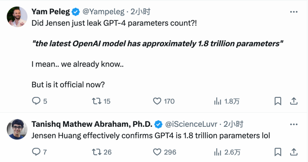 黄仁勋提到,大模型参数量正在呈指数级增长,此前 OpenAI 最大的模型已经有 1.8T 参数,需要吞吐数十亿 token。即使是一块 PetaFLOP 级的 GPU,训练这样大的模型也需要 1000 年才能完成。这句话还透露了一个关键信息:GPT-4 的实际参数量应该就是 1.8 万亿。