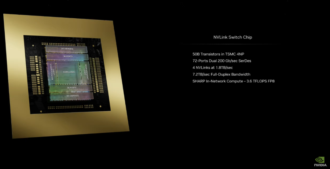 现在,英伟达的 NVLink Switch Chip 可以让所有这些芯片互联起来,全速运转没有瓶颈(1.8TB/s,几乎比上代快 10 倍),并帮助构建了 DGX GB200 NVL72。