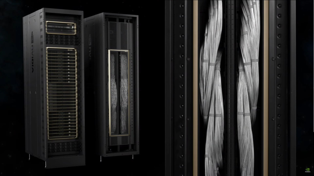 所以今年画风变了现在 DGX 长这样:拥有 5000 条 NVLink 电缆,长达 2 英里,都是铜电缆,不需要光收发器,节省了 20kW 的计算成本。