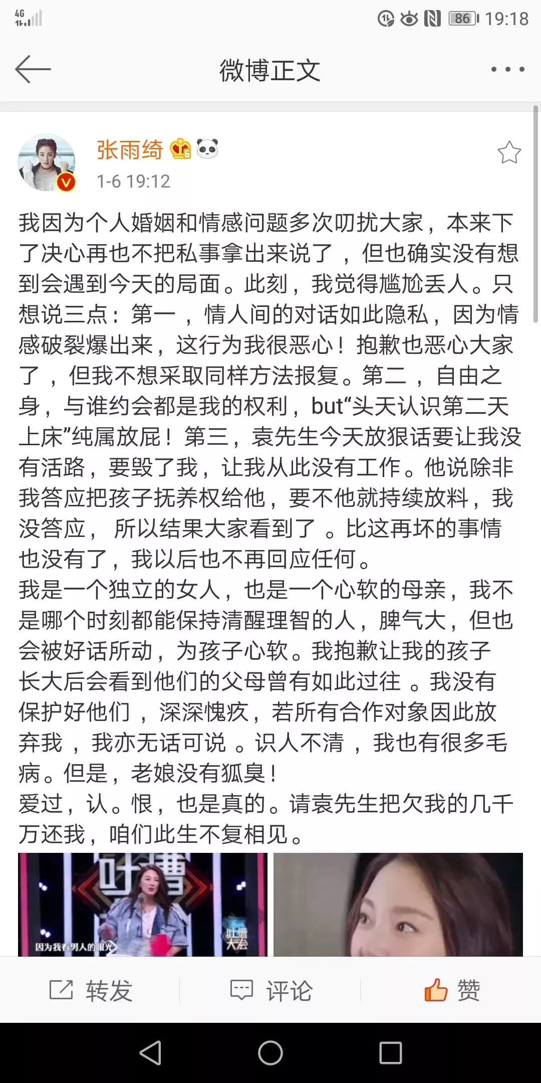 不能不说,张的前夫袁巴元的出手,还是快、准、狠的。先说张雨绮与他复合之后,又与某男士在酒店开房,连房间号都报出来了。又说张只认识该男士一天,甚至还发狠话:“不把你这个有狐臭的女人搞死,你又去害别人。”